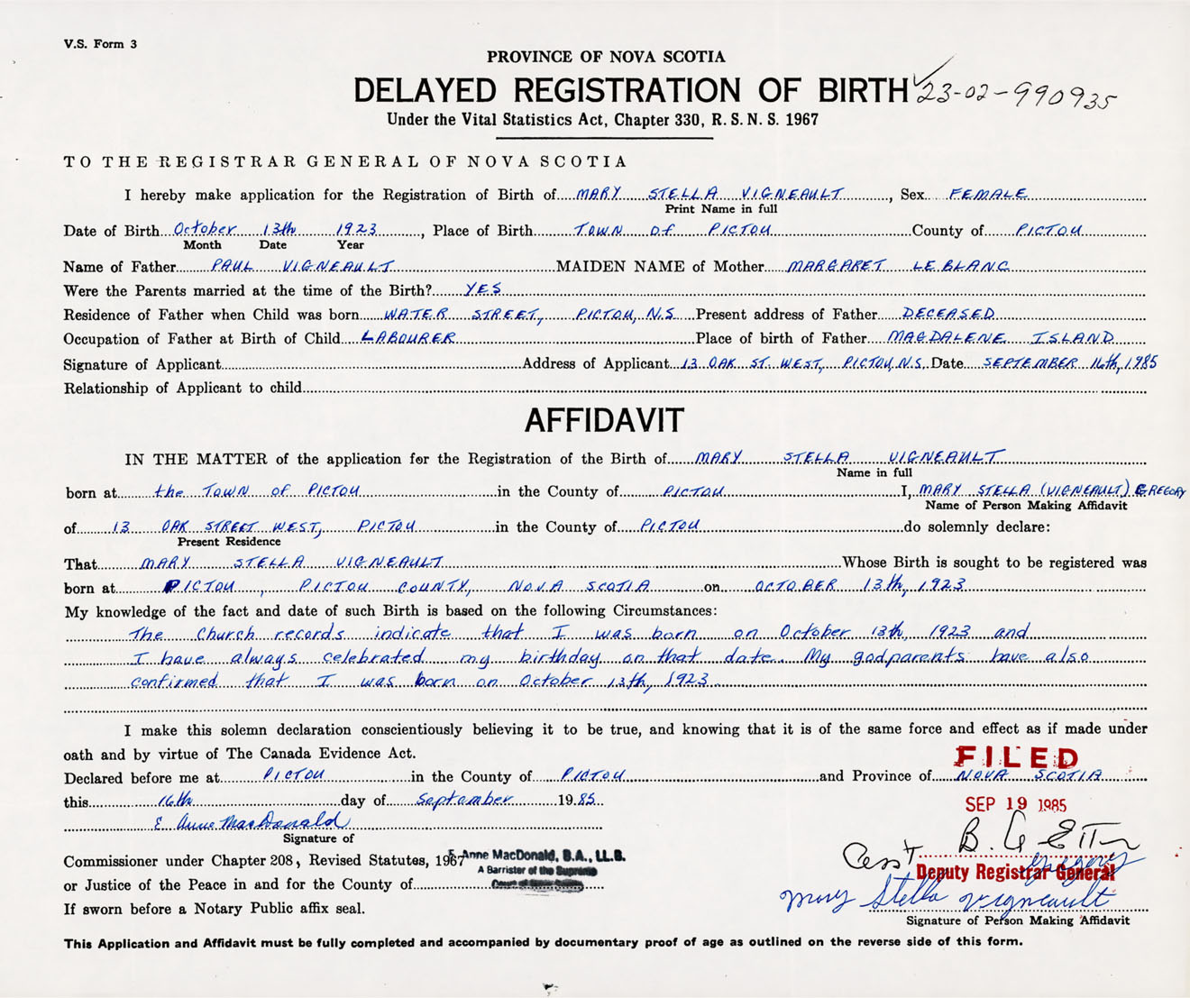 Signature of Applicant Mary Stella Vigneault Gregory Address of Applicant 13 Oak Street West, Pictou Co., NS Date 16 September 1985