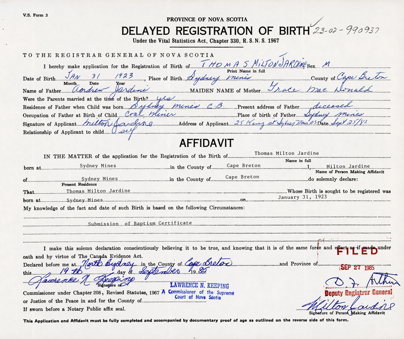 Signature of Applicant Milton Jardine Address of Applicant 25 King Street, Sydney Mines, Cape Breton Co., NS Date 25 September 1985