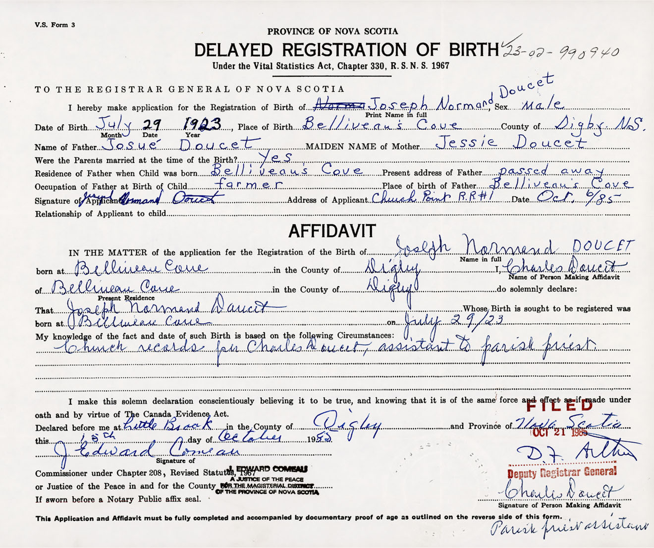 Signature of Applicant Joseph Normand Doucet Address of Applicant RR #1, Church Point, Digby Co., NS Date 6 October 1985