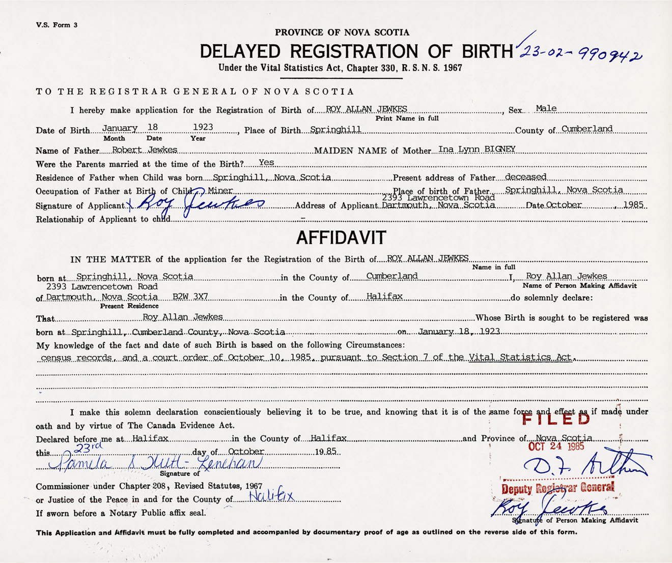 Census records and a court order of October 10, 1985. Pursuant to Section 7 of the Vital Statistics Act.