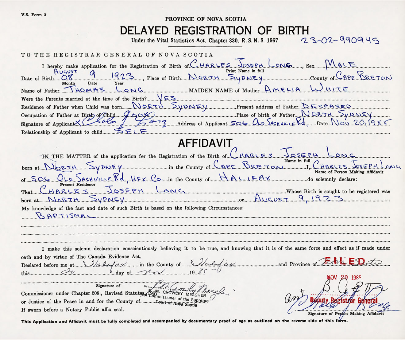 I hereby make application for the Registration of Birth of Charles JosephLong Sex Male
