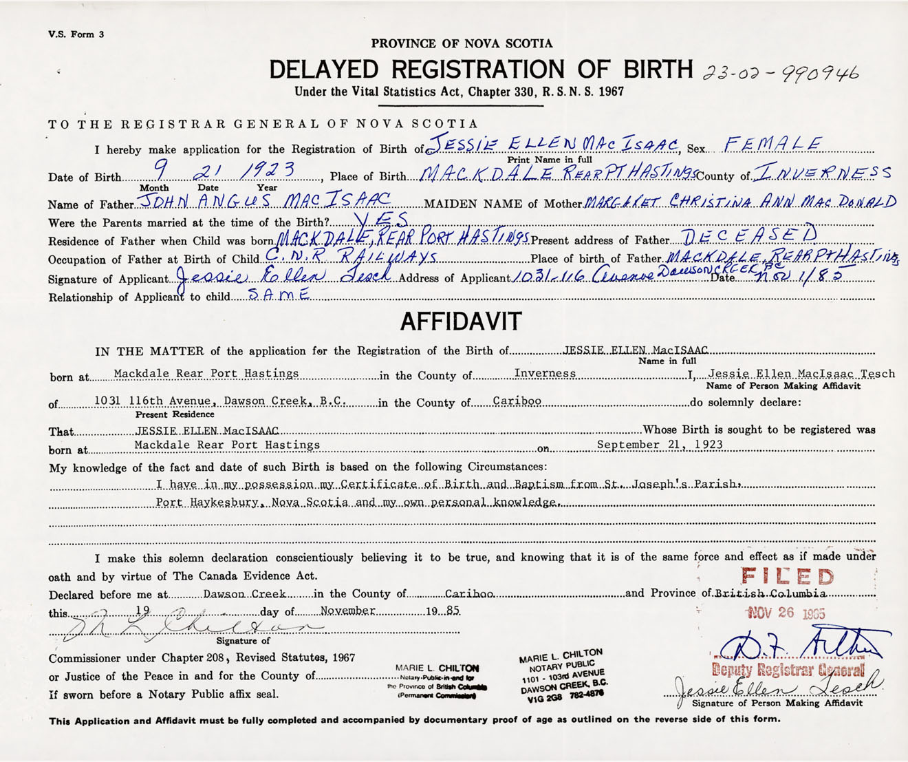 Date of Birth September 21, 1923 Place of Birth Mackdale Rear, Port HastingsCounty of Inverness