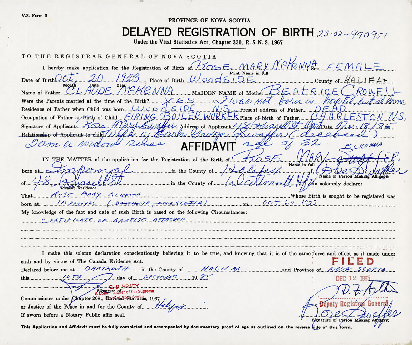 Signature of Applicant Rose Mary Swaffer Address of Applicant 48 Russell Street, Dartmouth, NS Date 18 November 1985