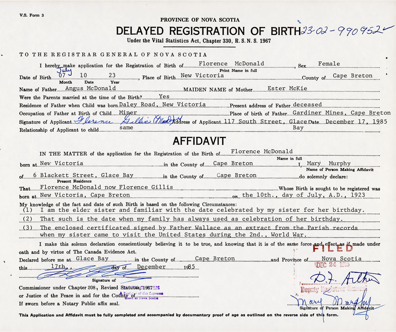Signature of Applicant Florence Gillis McDonald Address of Applicant 117 South Street, Glace Bay, Cape Breton Co., NS Date 17 December 1985