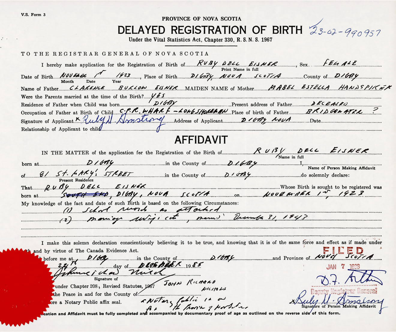 Signature of Applicant Ruby D. Armstrong Address of Applicant Digby, NS Date December 1985