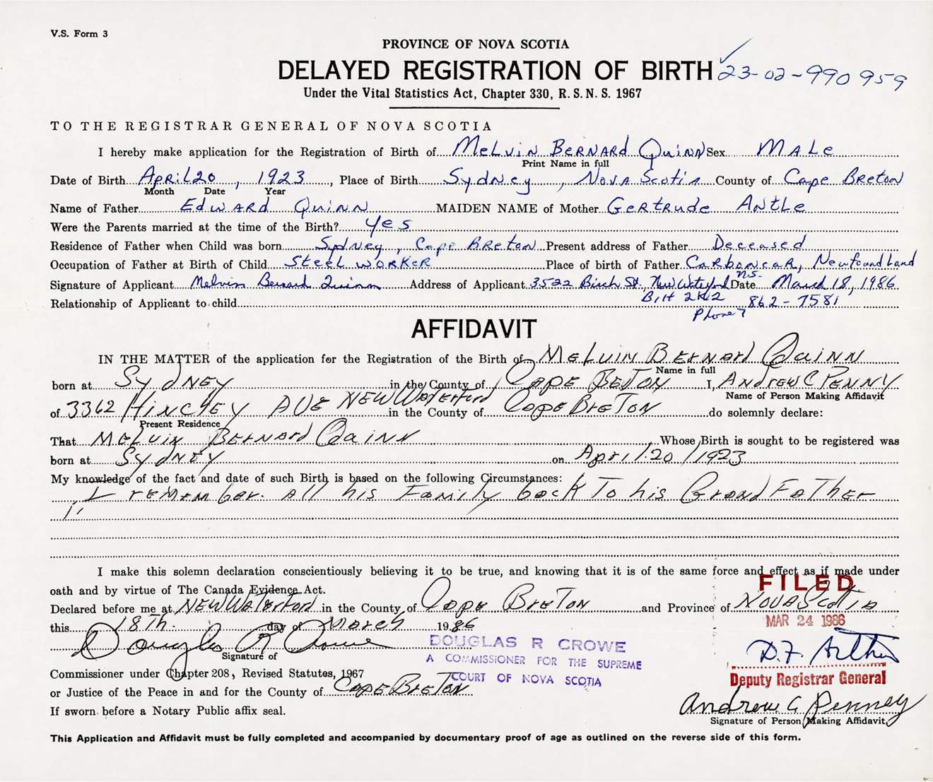 Signature of Applicant Melvin Bernard Quinn Address of Applicant 3522 Birth Street, New Waterford, Cape Breton Co., NS, B1H 2K2 Date 18 March 1986