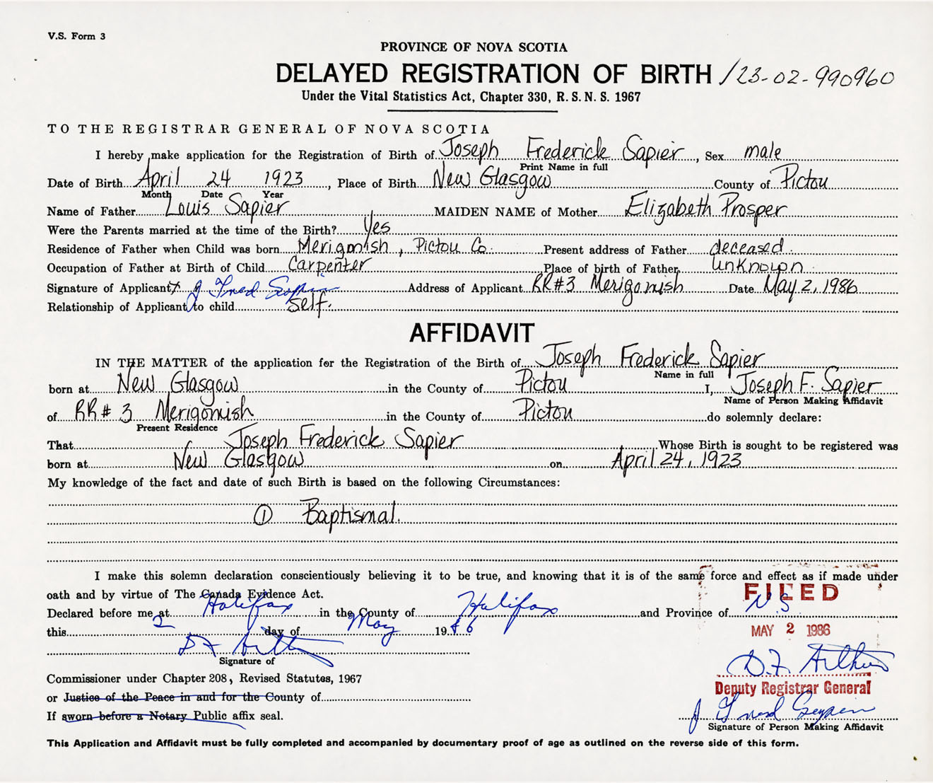Signature of Applicant J. Fred Sapier Address of Applicant RR #3, Merigomish, Pictou Co., NS Date 2 May 1986