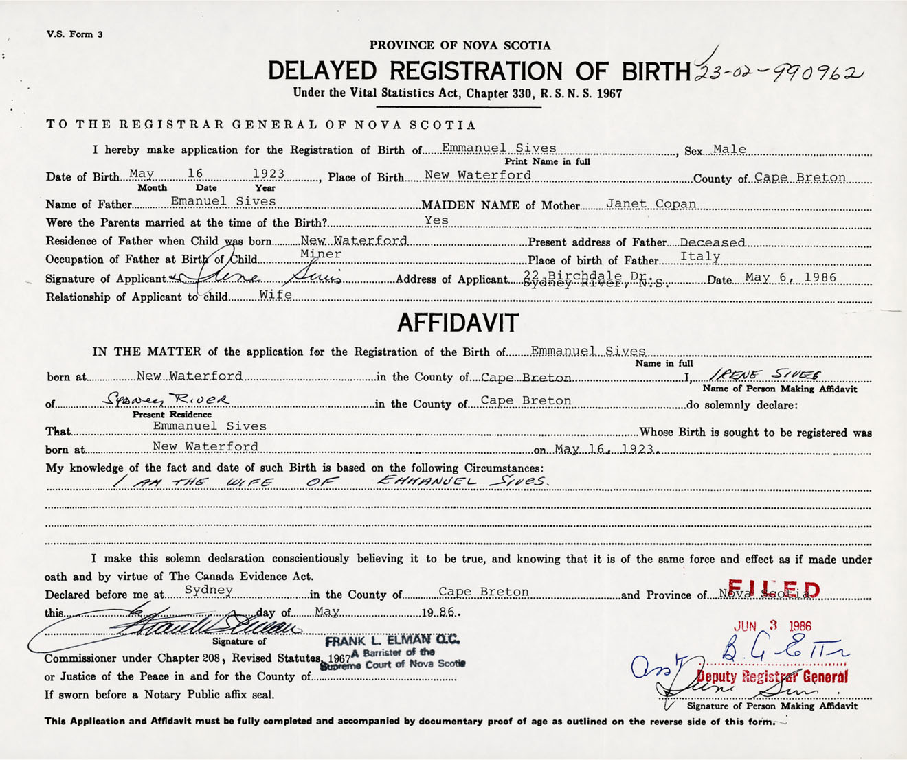 I hereby make application for the Registration of Birth of EmmanuelSives Sex Male