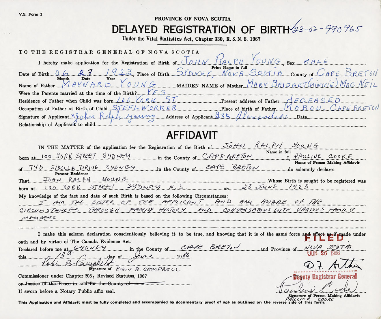Signature of Applicant John Ralph Young Address of Applicant 235 Alexandra Street, Sydney, Cape Breton Co., NS Date June 1986