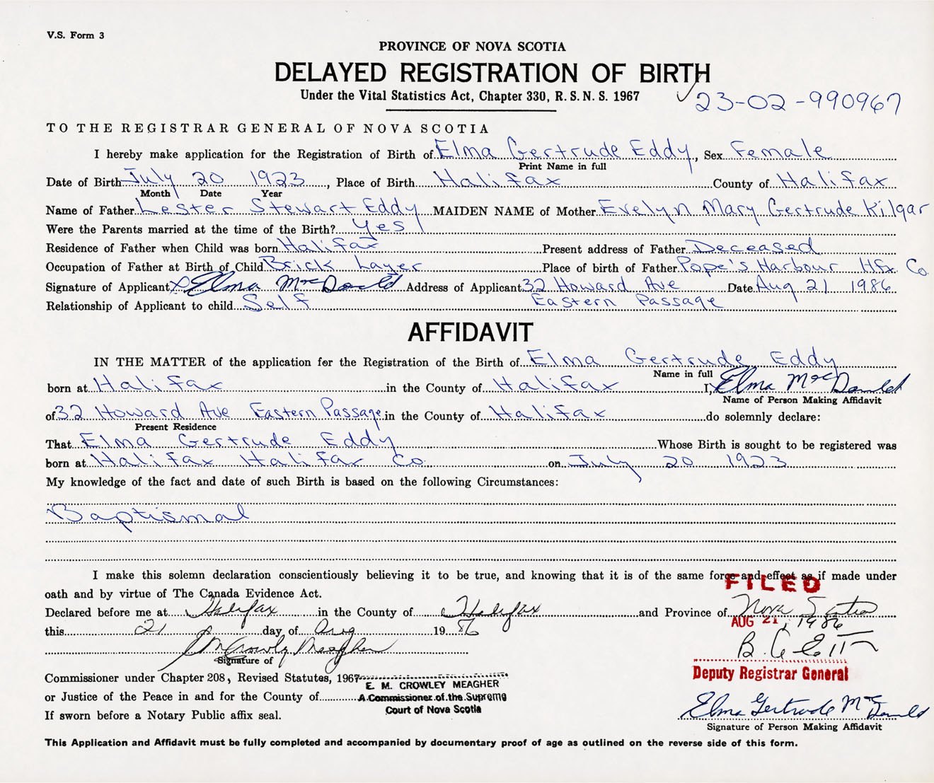 Signature of Applicant Elma MacDonald Address of Applicant 32 Howard Avenue, Eastern Passage, Halifax Co., NS Date 21 August 1986