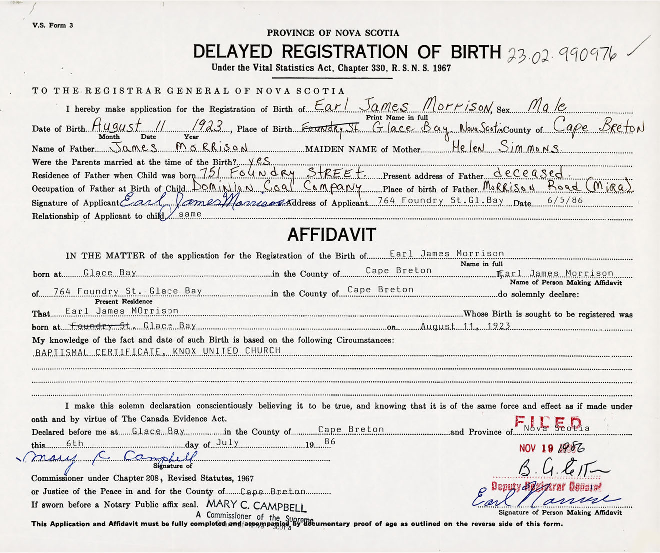 Signature of Applicant Earl James Morrison Address of Applicant 764 Foundry Street, Glace Bay, Cape Breton Co., NS Date 6 May 1986