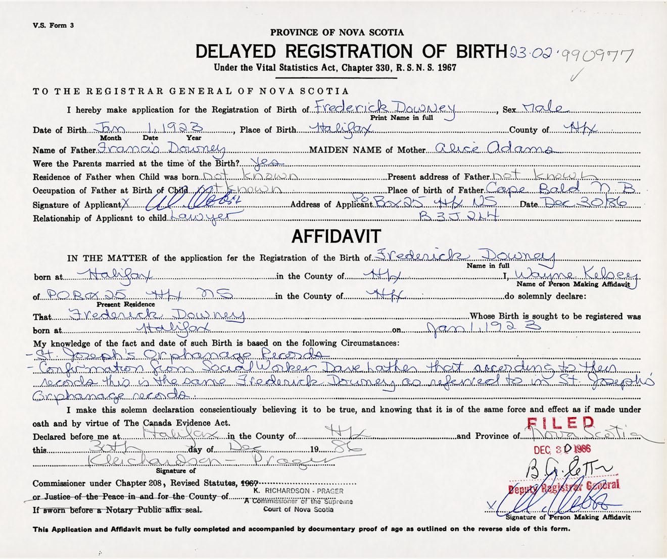 IN THE MATTER of the application for the Registration of the Birth of FrederickDowney