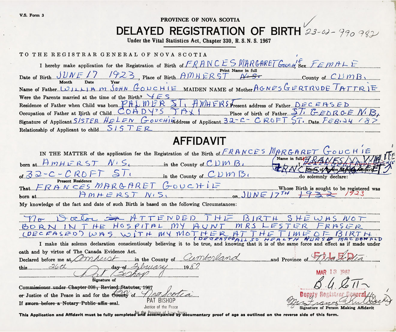 Signature of Applicant Sister Helen Gouchie Address of Applicant 32c Croft Street, Amherst, Cumberland Co., NS Date 24 February 1987