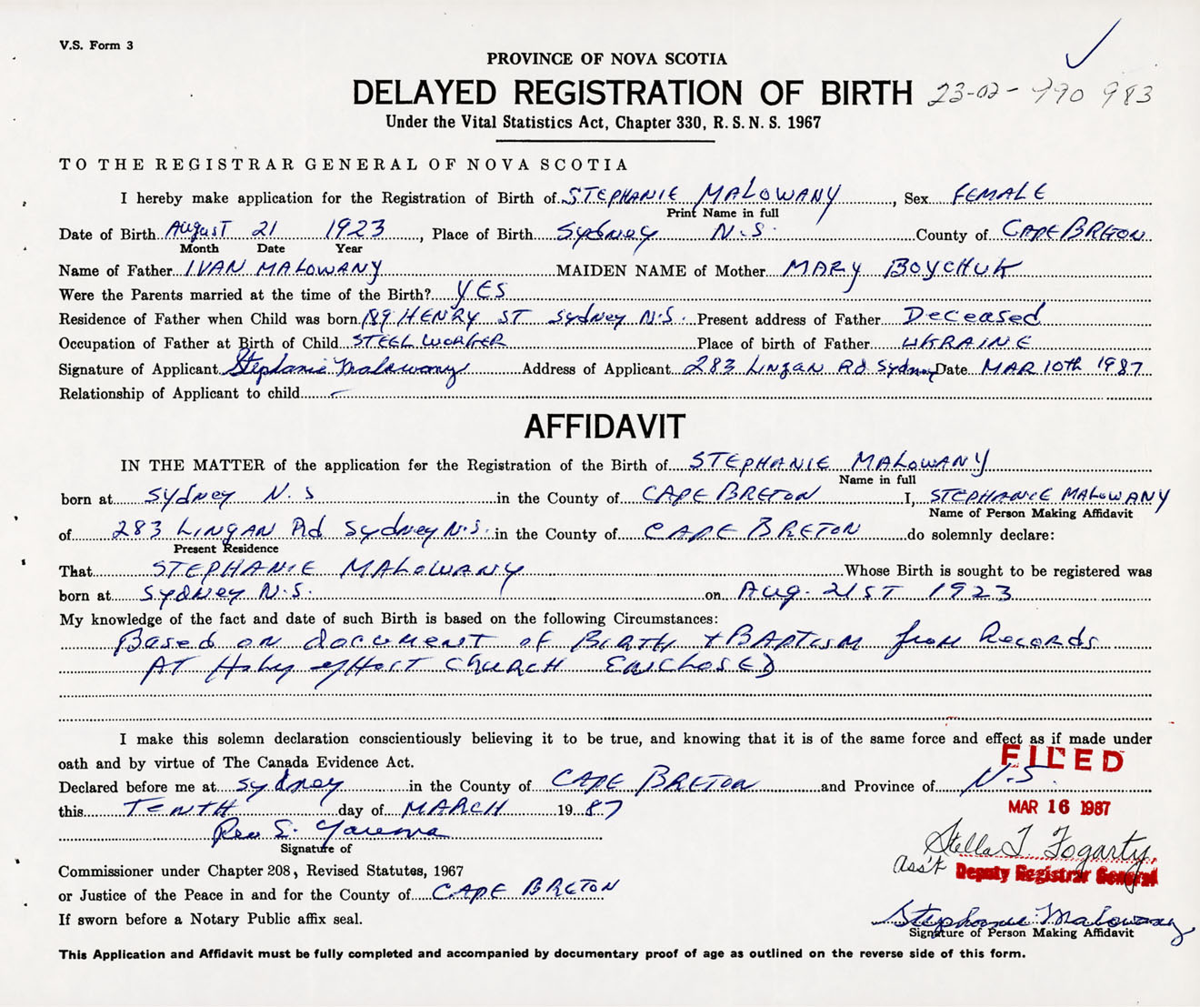Signature of Applicant Stephanie Malowany Address of Applicant 283 Lingan Road, Sydney, Cape Breton Co., NS Date 10 March 1987