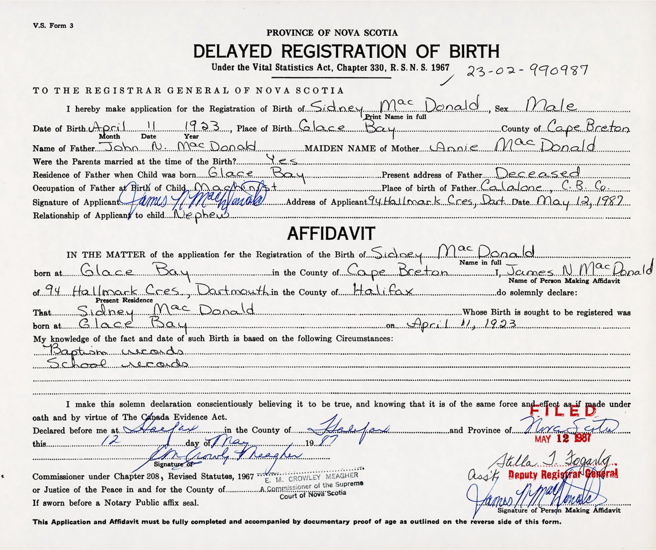 IN THE MATTER of the application for the Registration of the Birth of SydneyMacDonald