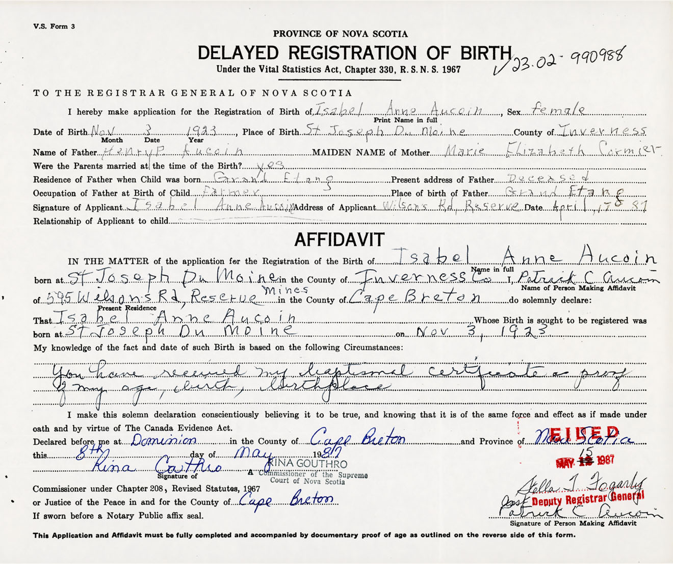 Signature of Applicant Isabel Anne Aucoin Address of Applicant Wilsons Road, Reserve, Cape Breton Co., NS Date 17 April 1987