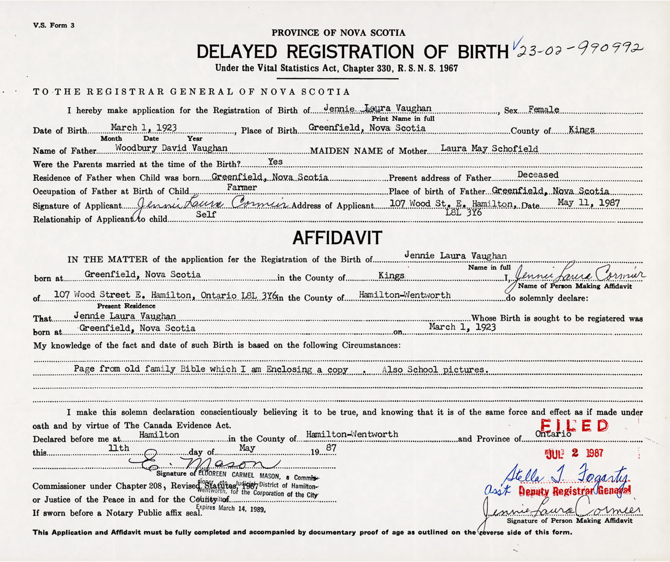 That Jennie LauraVaughan Whose Birth is sought to be registered was