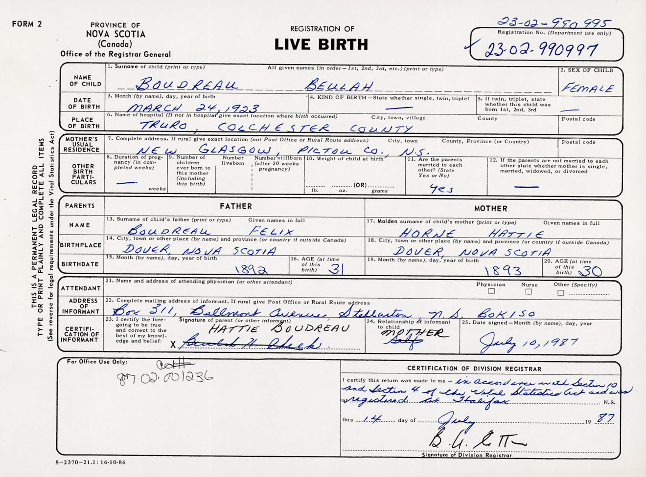 I hereby make application for the Registration of Birth of BeulahBoudreau Sex Female