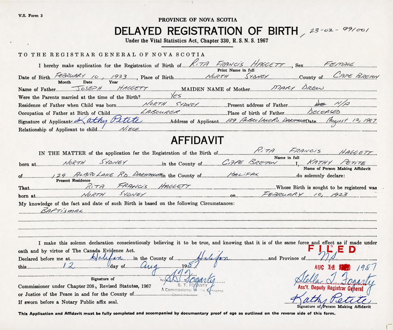I hereby make application for the Registration of Birth of Rita FrancisHaggett Sex Female