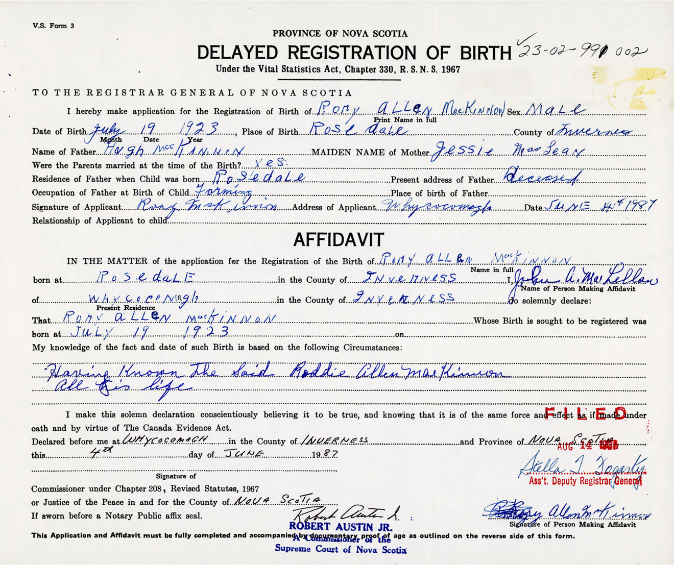 Signature of Applicant Rory MacKinnon Address of Applicant Whycocomagh, Inverness Co., NS Date 4 June 1987