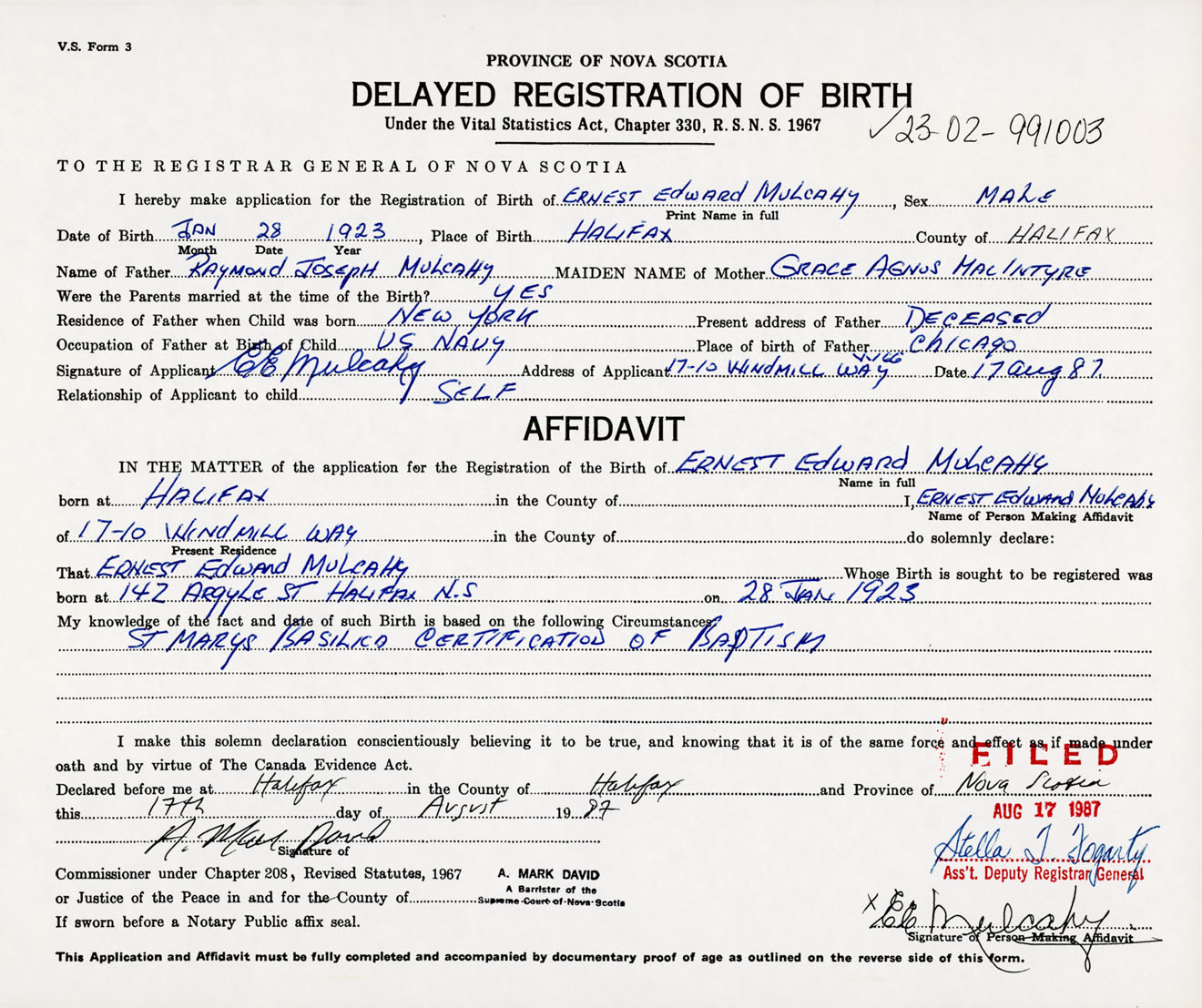 Signature of Applicant E. E. Mulcahy Address of Applicant 17 - 10 Windmill Way, Dartmouth, NS Date 17 August 1987