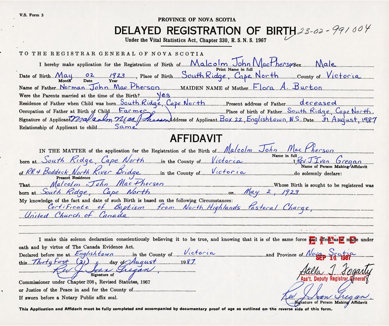 Signature of Applicant Malcolm MacPherson Address of Applicant Box 22, Englishtown, Victoria Co., NS Date 31 August 1987