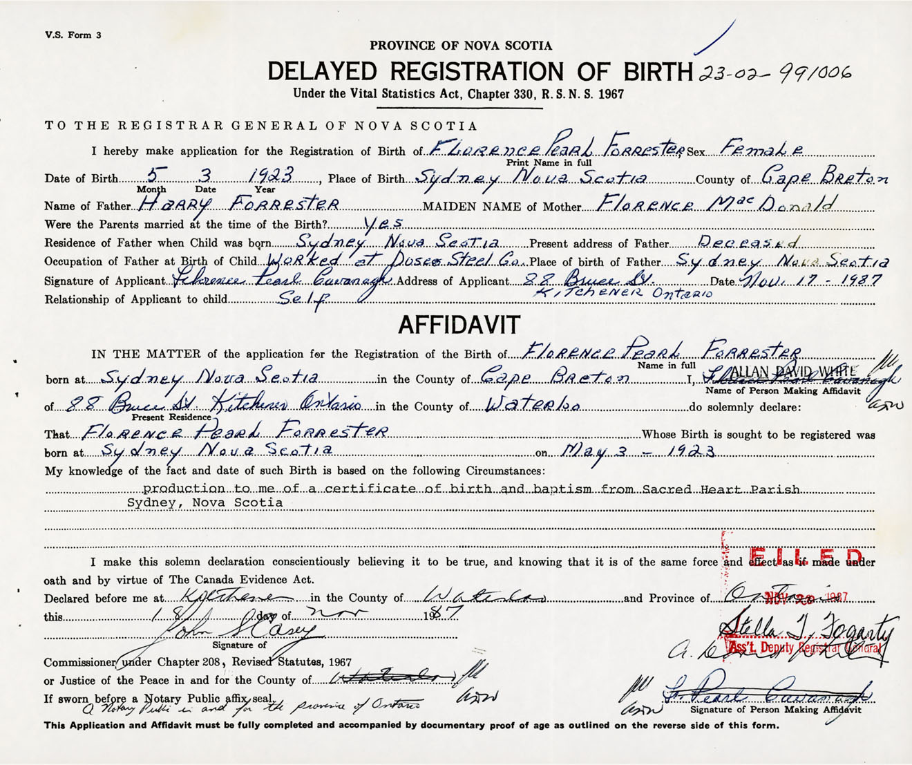 Date of Birth May 3, 1923 Place of Birth SydneyCounty of Cape Breton