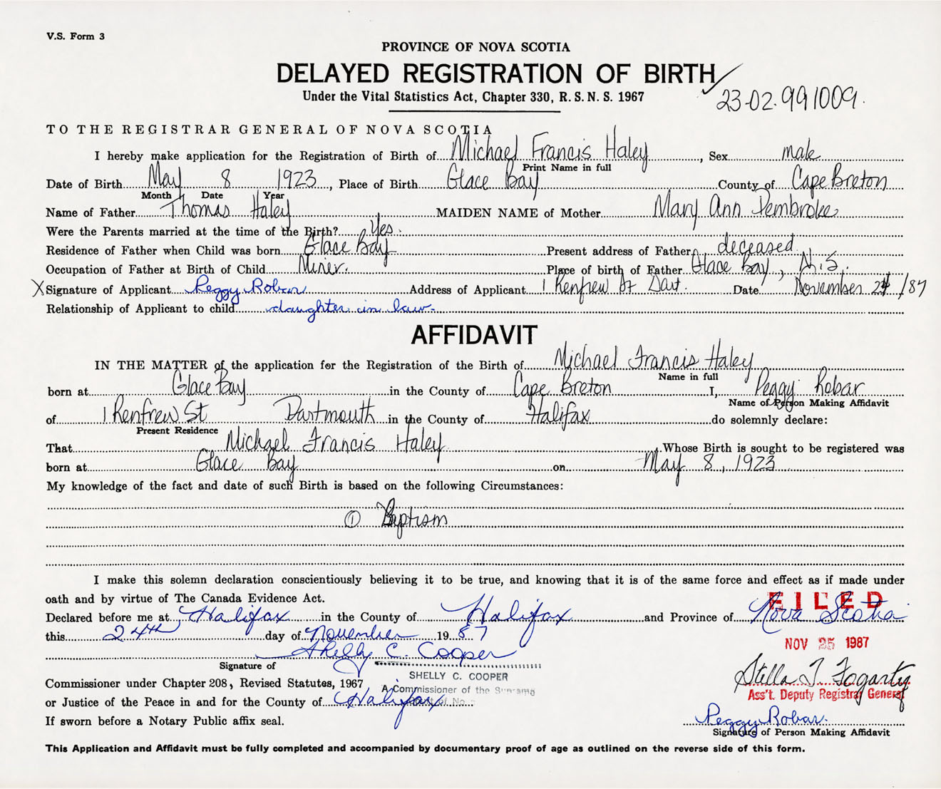 Signature of Applicant Peggy Robar Address of Applicant 1 Renfrew Street, Dartmouth, NS Date 24 November 1987
