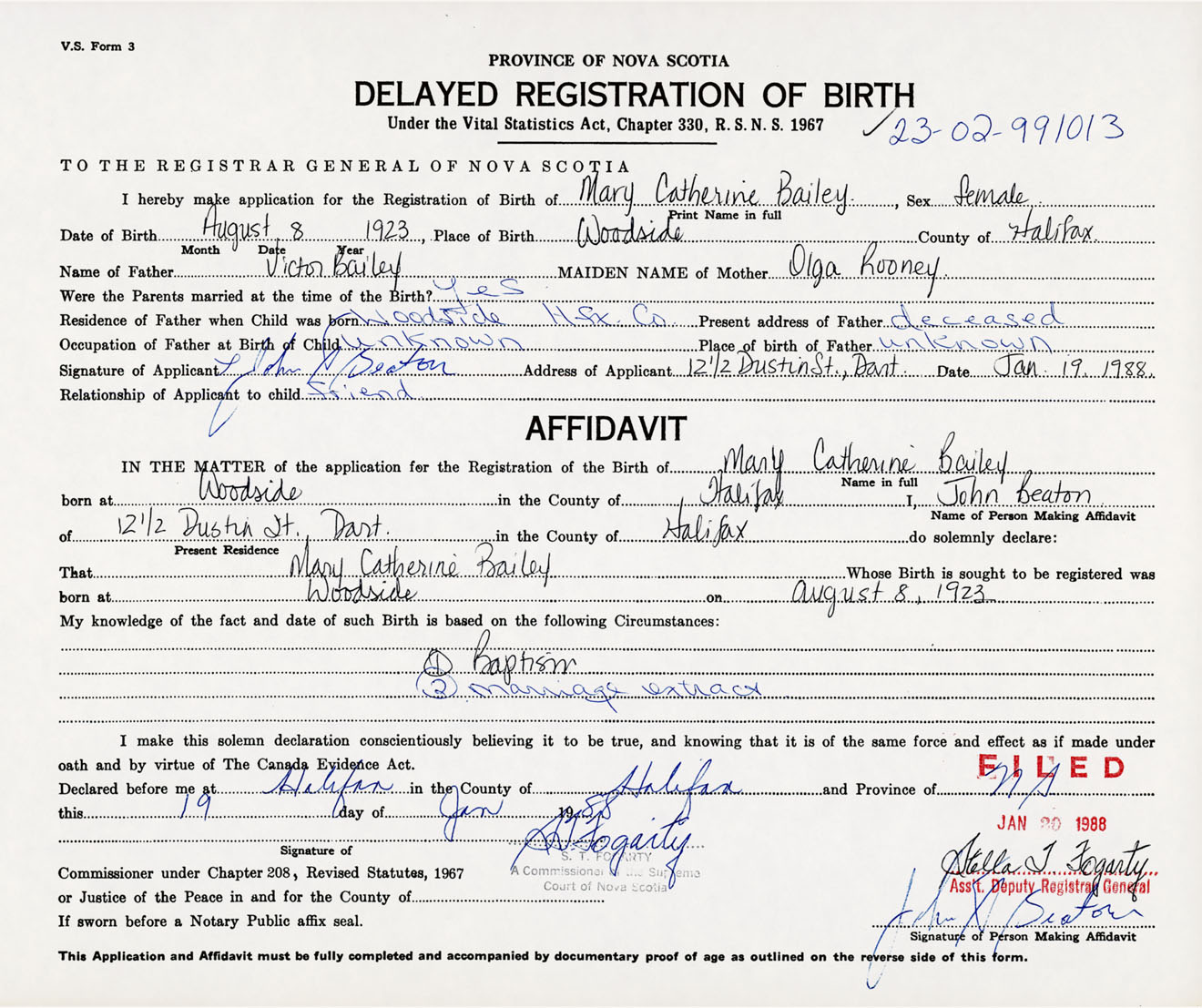 Date of Birth August 8, 1923 Place of Birth WoodsidCounty of Halifax