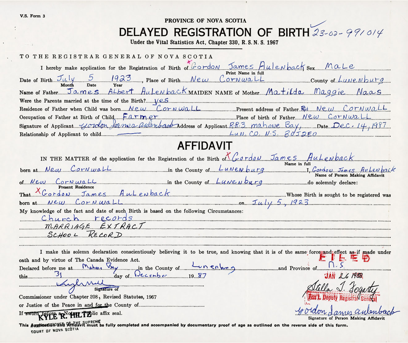 Signature of Applicant Gordon James Aulenback Address of Applicant RR #3, Mahone Bay, Lunenburg Co., NS Date 14 December 1987