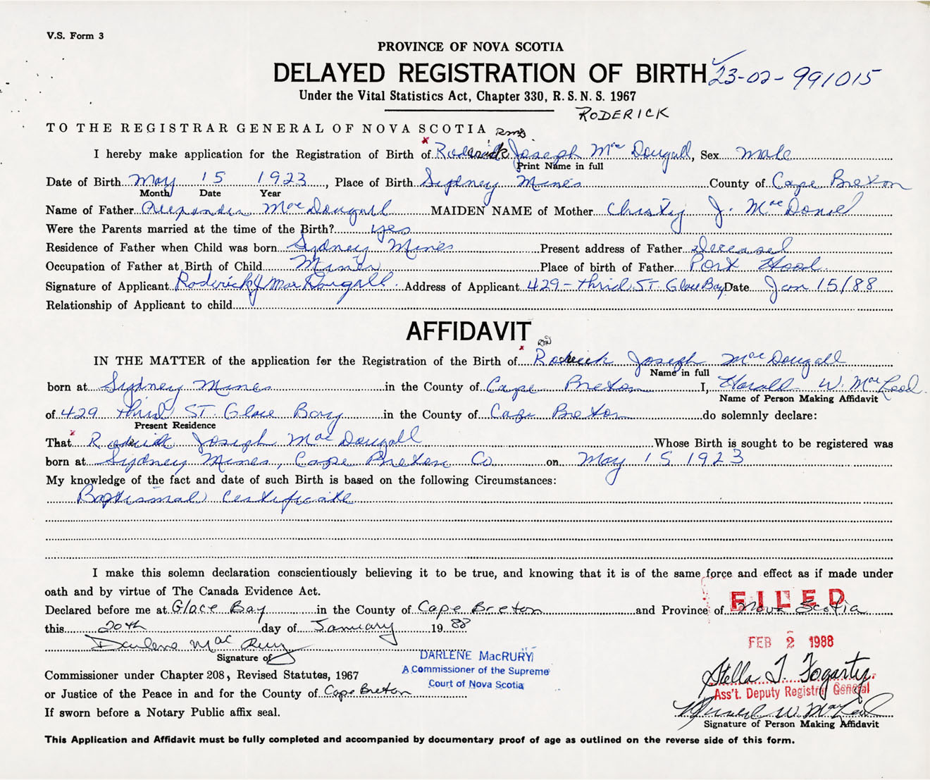 Signature of Applicant Roderick J. MacDougall Address of Applicant 429 Third Street, Glace Bay, Cape Breton Co., NS Date 15 January 1988