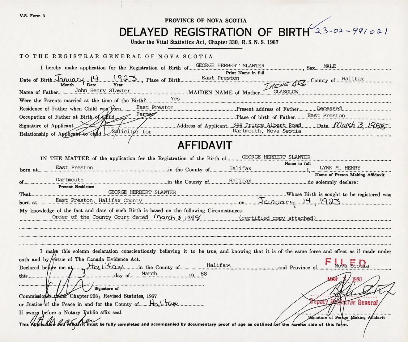 Signature of Applicant Lynn M. Henry Address of Applicant 344 Prince Albert Road, Dartmouth, NS Date 3 March 1988