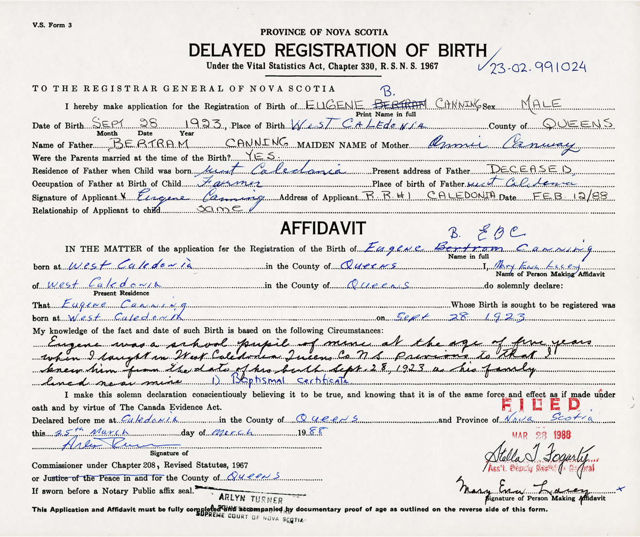 Signature of Applicant Eugene Canning Address of Applicant RR #1, Caledonia, Queens Co., NS Date 12 February 1988