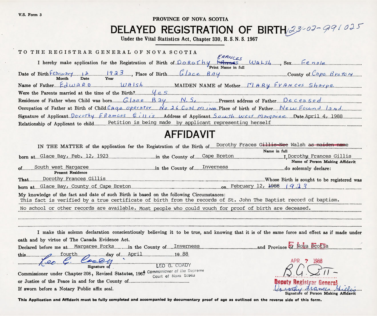 Signature of Applicant Dorothy Frances Gillis Address of Applicant South West Margaree, Inverness Co., NS Date 4 April 1988