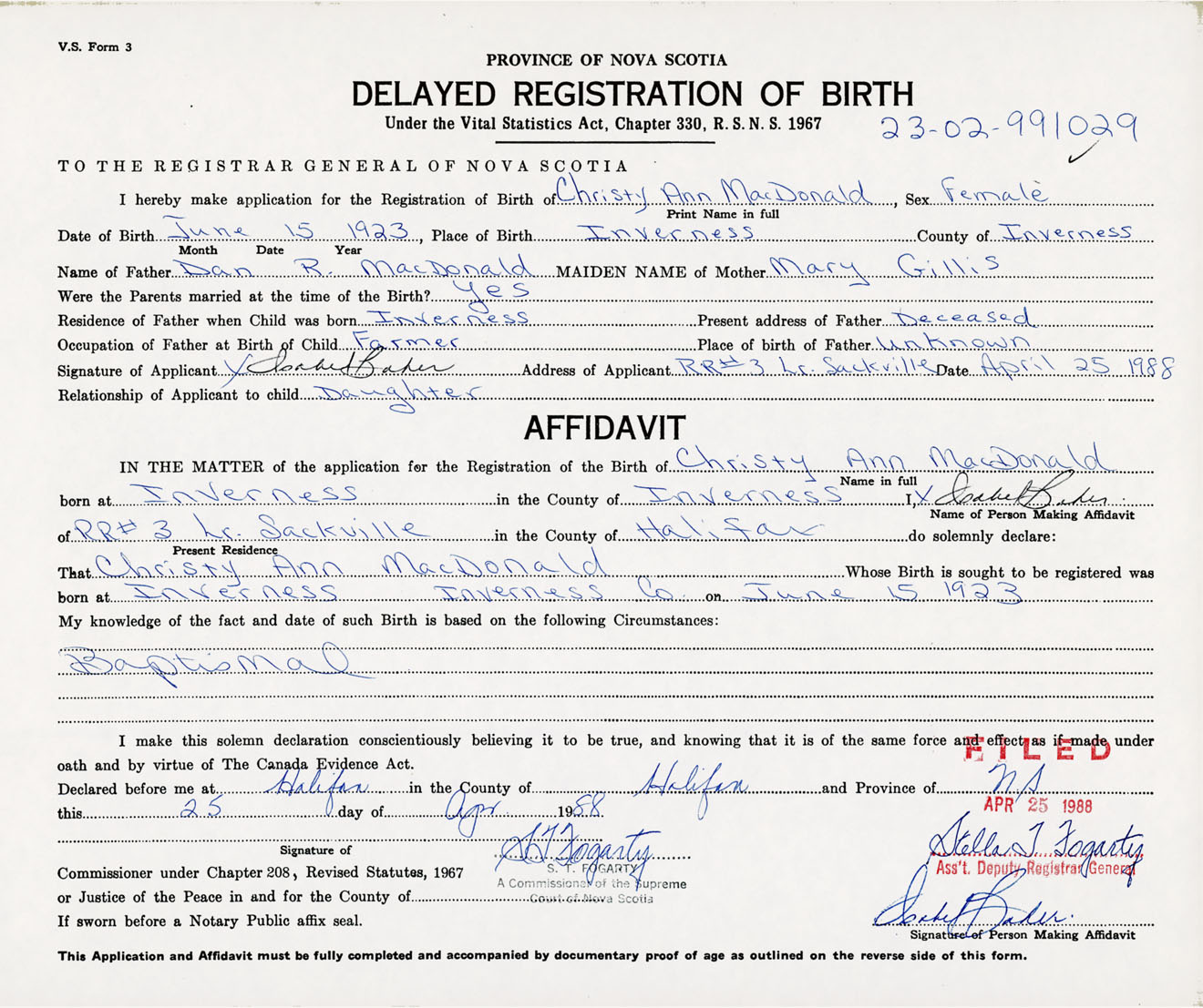 I hereby make application for the Registration of Birth of Christy AnnMacDonald Sex Female