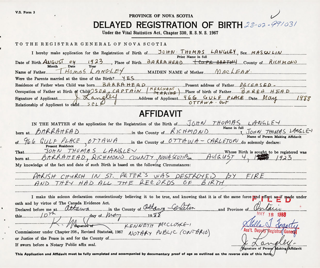 Name of Father Thomas Langley MAIDEN NAME of Mother MacLean