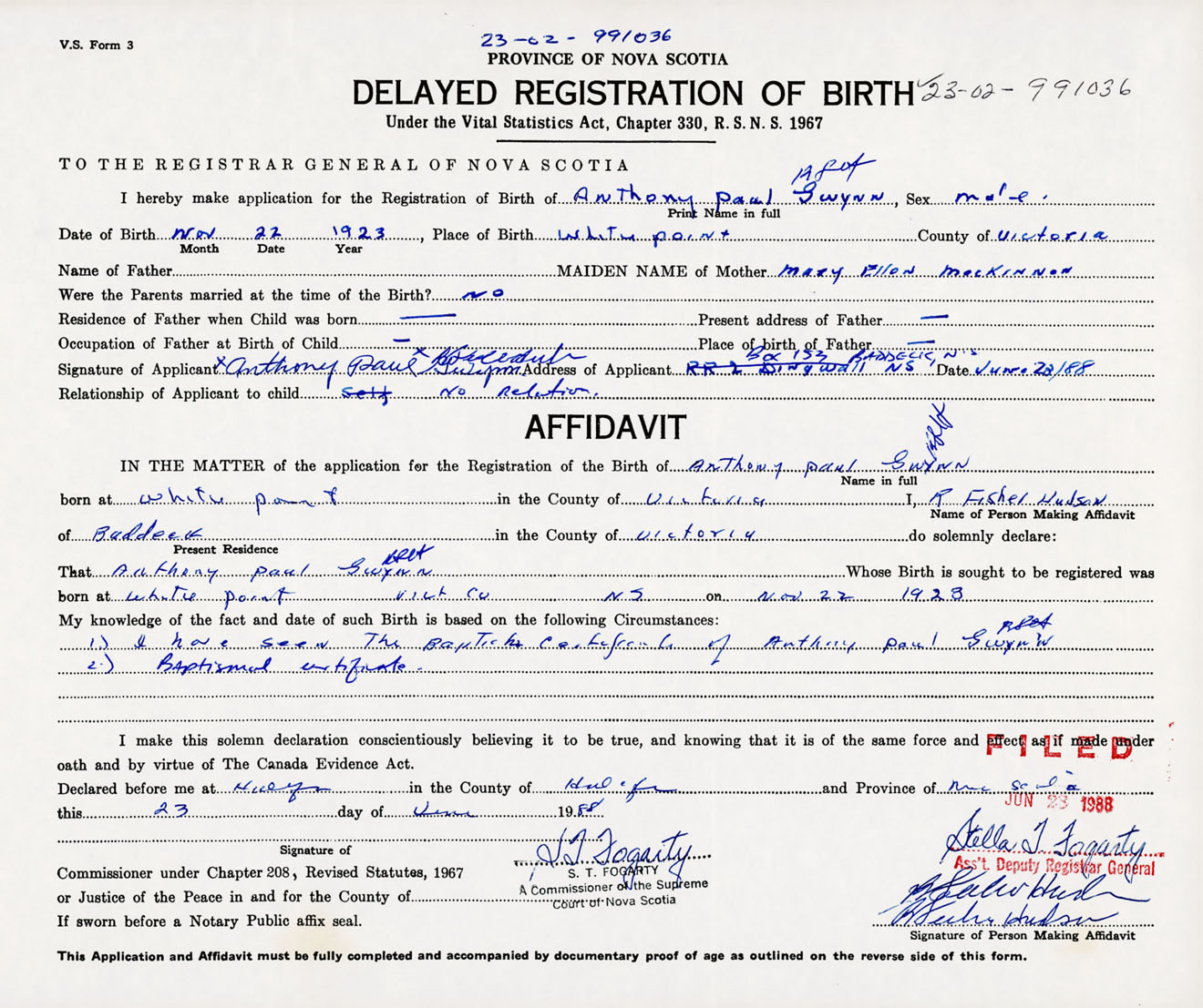 Signature of Applicant Anthony Paul Gwynn Address of Applicant Box 133, Baddeck, Victoria Co., NS Date 23 June 1988