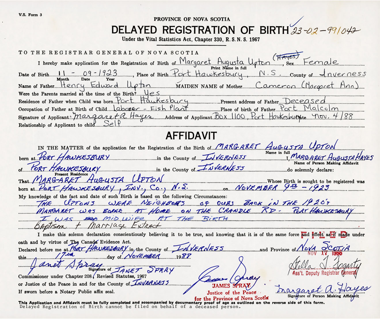 Date of Birth November 9, 1923 Place of Birth Port HawkesburyCounty of Inverness