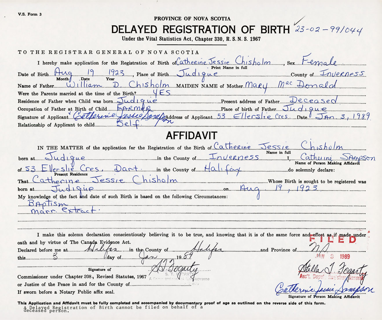Signature of Applicant Catherine Jessie Smapson Address of Applicant 55 Ellerslie Cres. Dartmouth Date January 3, 1989