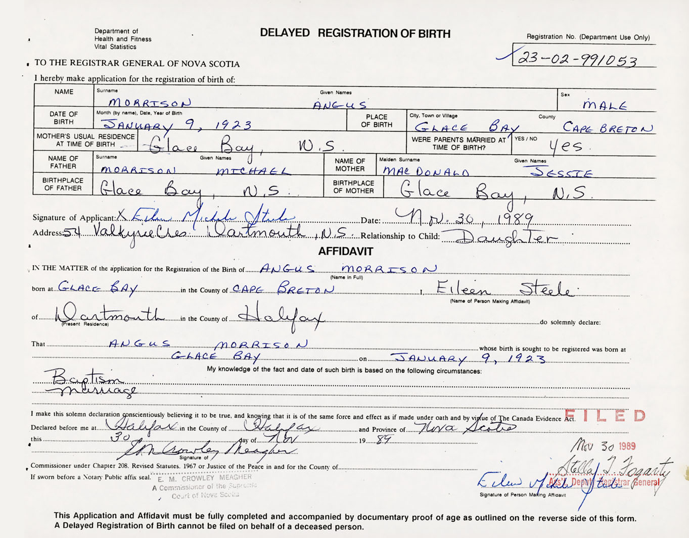 Date of Birth January 9, 1923 Place of Birth Glace BayCounty of Cape Breton