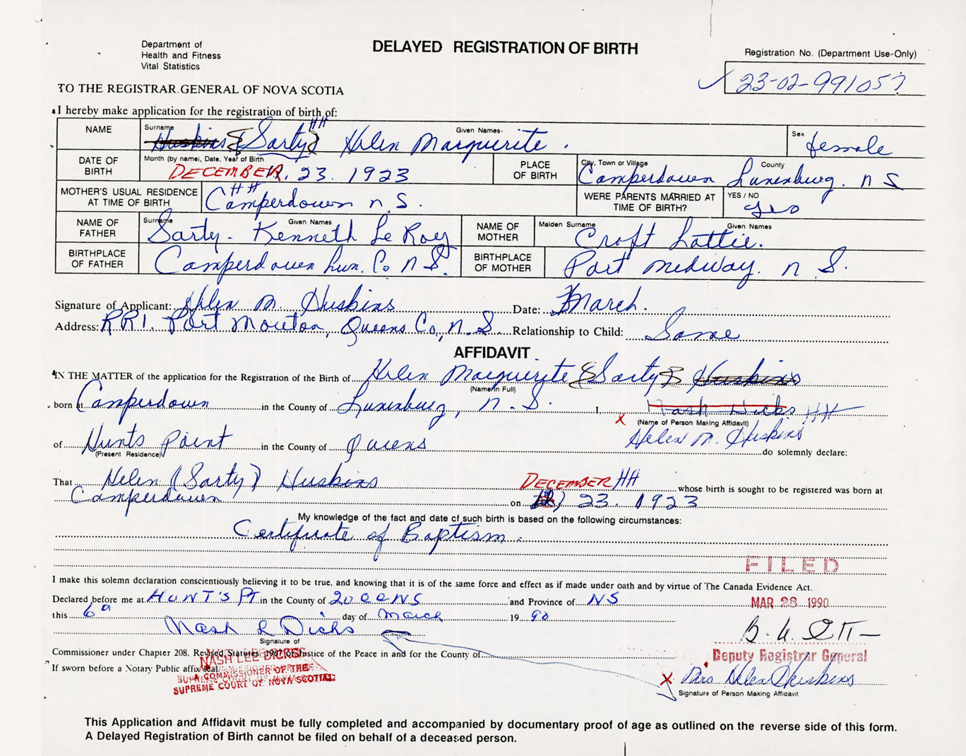 Signature of Applicant Helen M. Huskins Address of Applicant RR 1 Port Mouton Date March 6, 1990