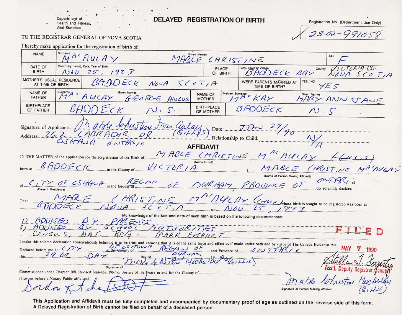 Signature of Applicant Mable Christine MacAulay Gillis Address of Applicant 262 Labrador Dr., Oshawa, Ontario Date January 29, 1990