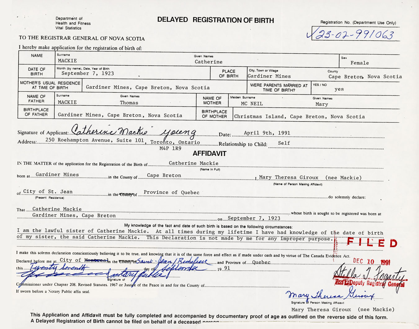 Signature of Applicant Catherine MacKie Young Address of Applicant 250 Roehampton Ave. Toronto, Ontario Date April 9, 1991