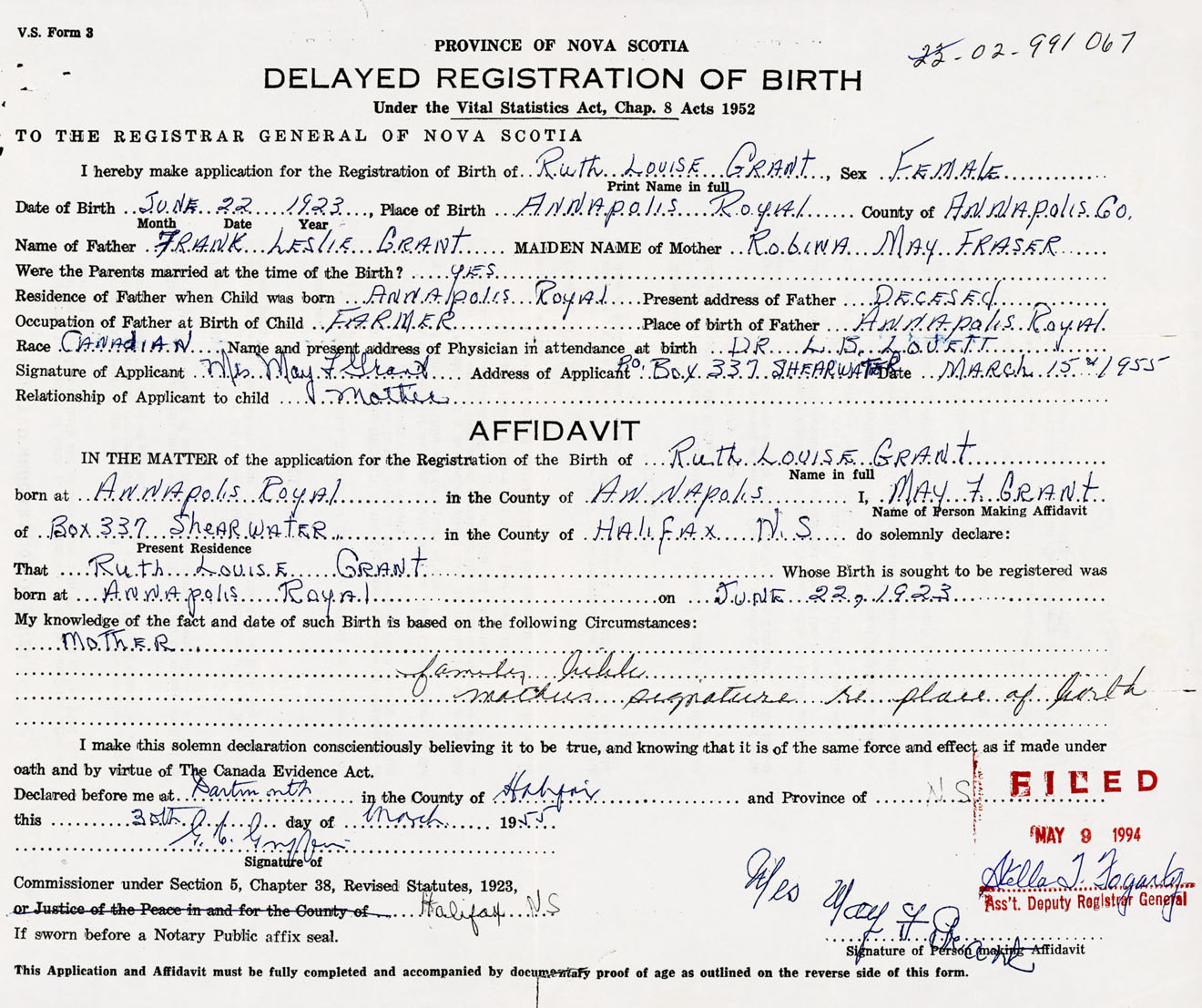 Date of Birth June 22, 1923 Place of Birth Annapolis RoyalCounty of Annapolis