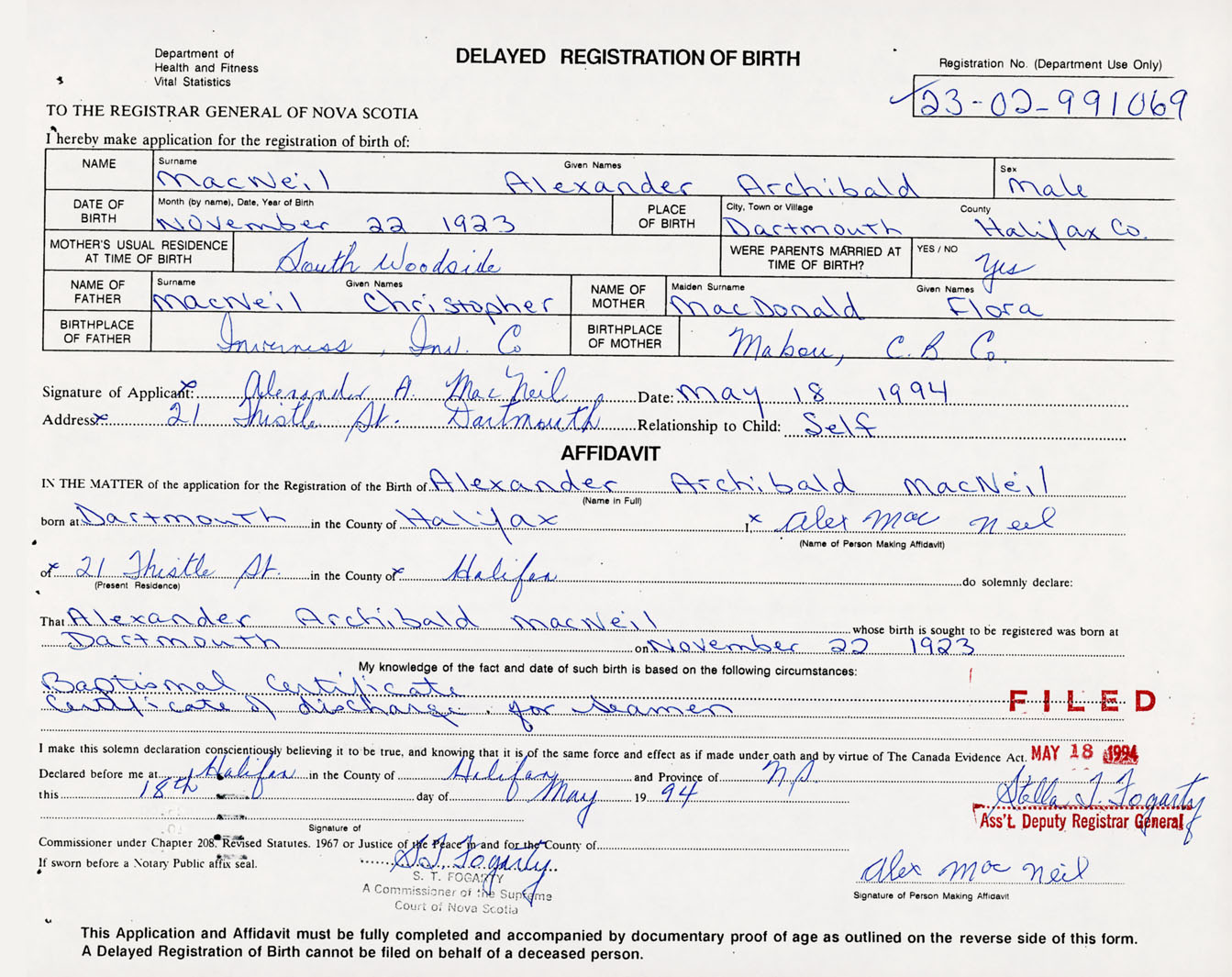 That Alexander ArchibaldMacNeil Whose Birth is sought to be registered was