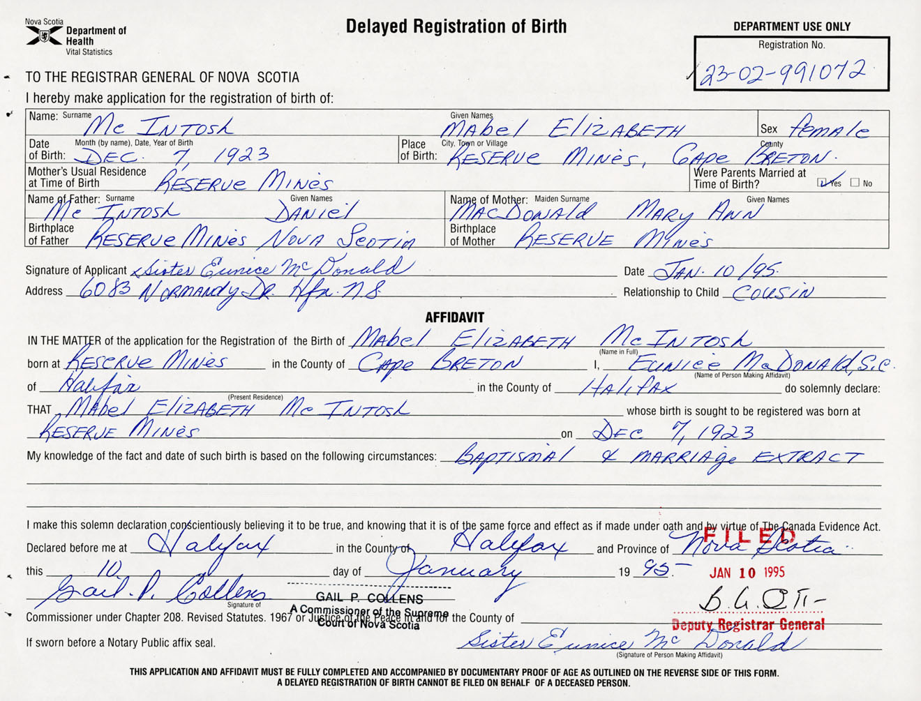 I hereby make application for the Registration of Birth of Mabel ElizabethMcIntosh Sex Female