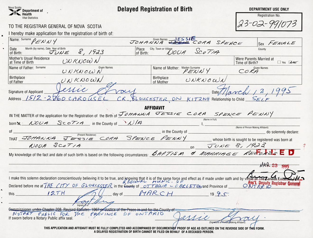 IN THE MATTER of the application for the Registration of the Birth of Johanna Jessie Cora SpenceFraser Penny