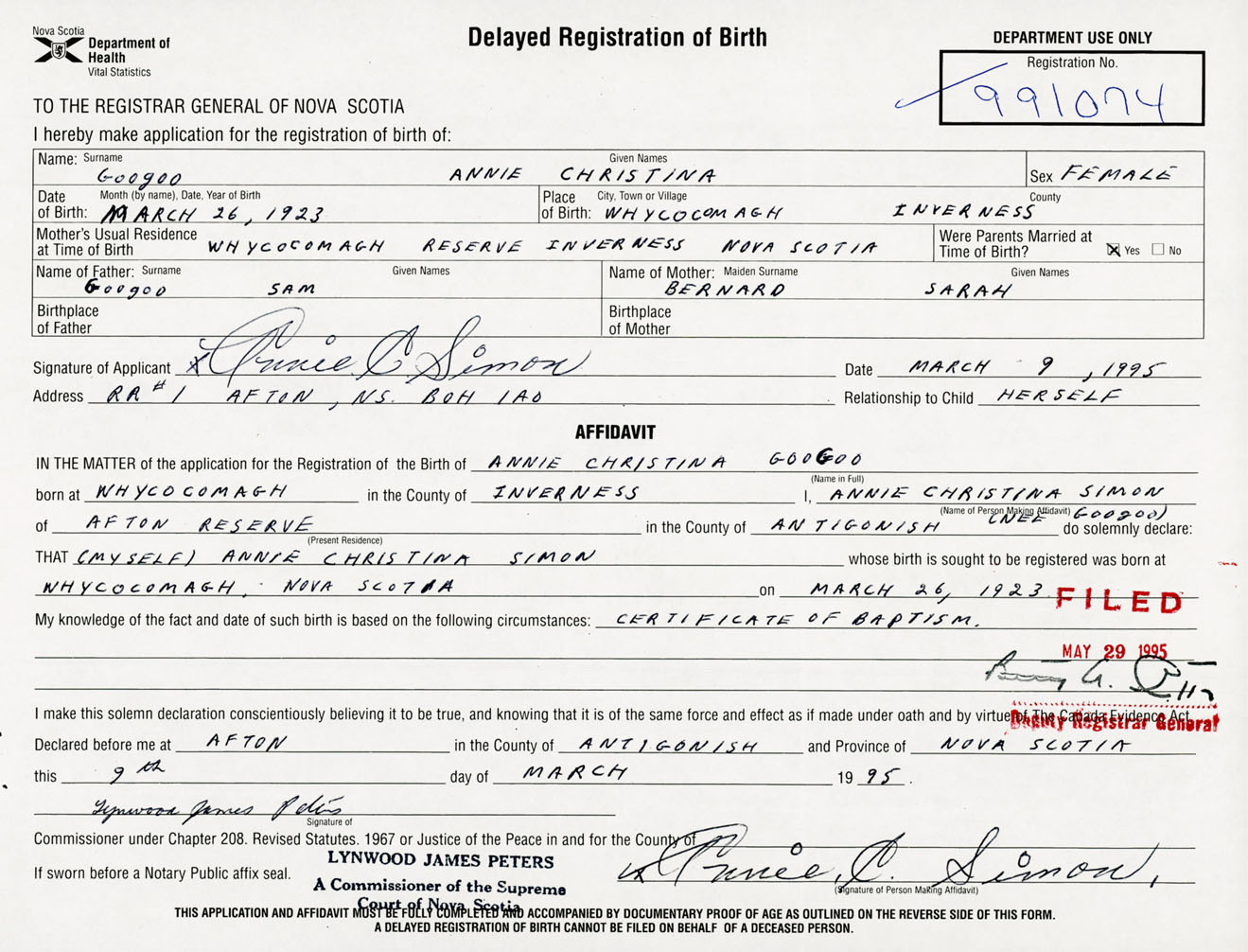 Date of Birth March 26, 1923 Place of Birth Whycocomagh ReserveCounty of Inverness