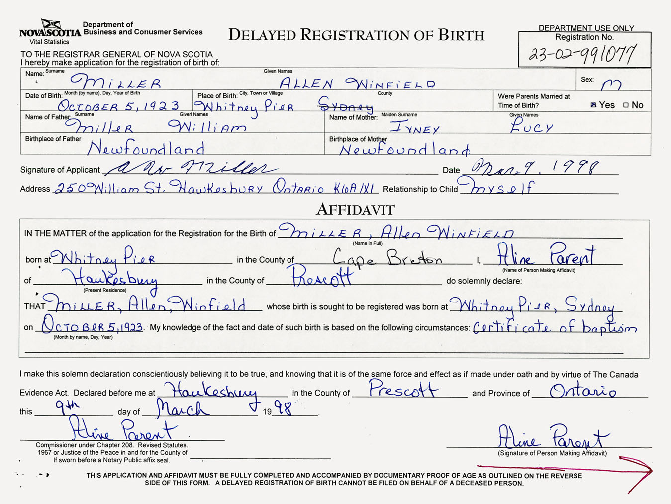 Date of Birth October 5, 1923 Place of Birth Whitney PierCounty of Cape Breton
