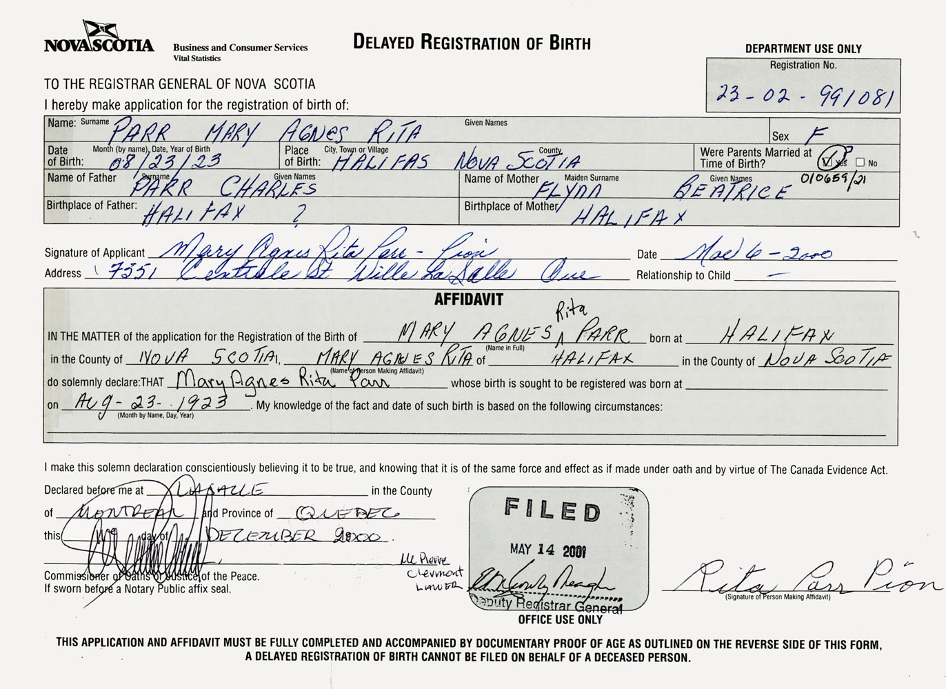 21. Name and Post Office address of Informant Mary Agnes Rita Parr-Lion 7351 Centrale St. Ville La Salle Quebec